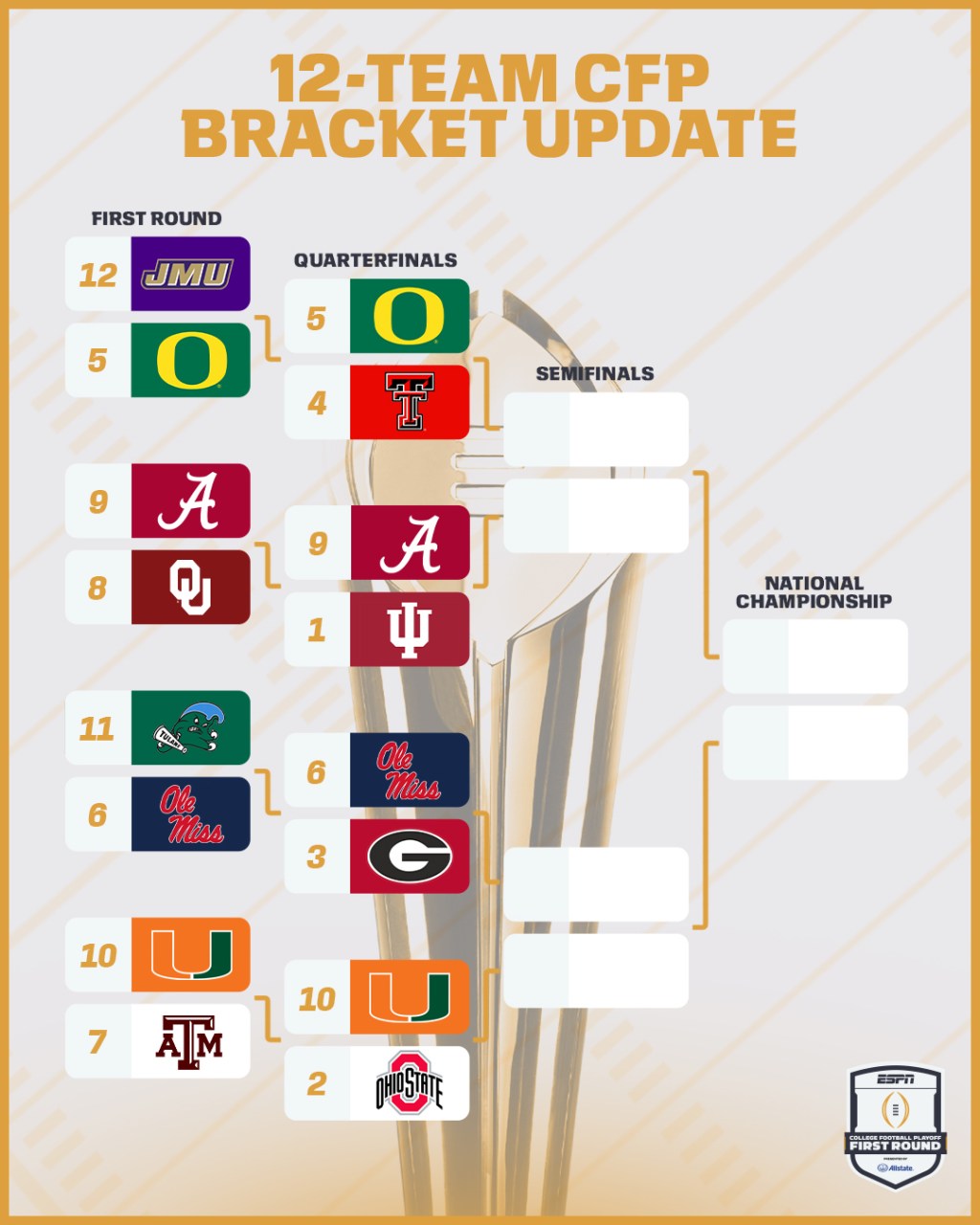 | 1/1 12 ET | ![]() | 5 Oregon vs 4 Texas Tech Hard Rock Stadium Miami | ![]() Joe Tessitore Jesse Palmer |